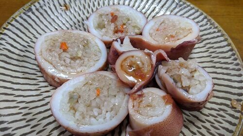 お隣さんが「佐藤さ~ん ごめ~ん 小さいのしか釣れんかった~」とケンサキイカを5杯。 全然、刺身にできるサイズだけど人生は挑戦。イカ飯を作ることにしました。 まずはイカを捌いて…次に、人参をみじん切りにしごぼうをみじん切りにし、アク抜きしうるち…