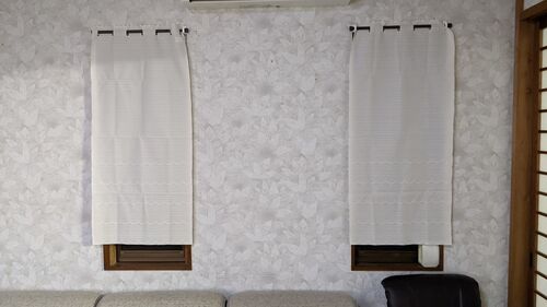 夕方、体力回復のため布団で仮眠をとろうとすると西日が差し込み木々が風に吹かれチラチラ揺れて仮眠さえもできない。 ということでDIY。 窓の大きさを測りナフコに行ってポールやのれん、フックなどをかってミニカーテンづくり。 われながら、低コストでよ…