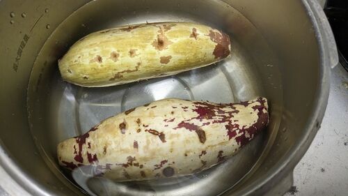 ある方のリクエストに応えて「干し芋」を試作。 まず、金ダワシで泥を落とし、薄側をむき茹でる。 第一の失敗はココ。大きな芋を使ってしまい中まで火を通すまで時間がかかる。しかも中まで火が通るのを待っていたら外がボロボロになり切るという加工がしに…
